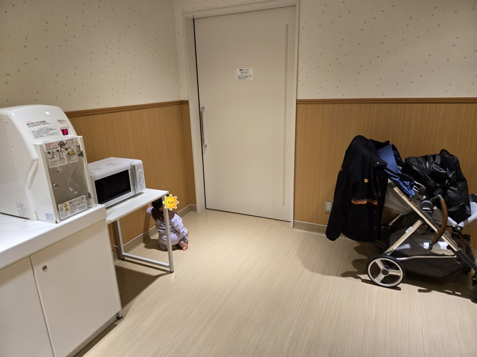 유아 휴게실에는 스토케의 트리트랩이 있고 전자렌지와 온수기가 마련되어 있습니다.