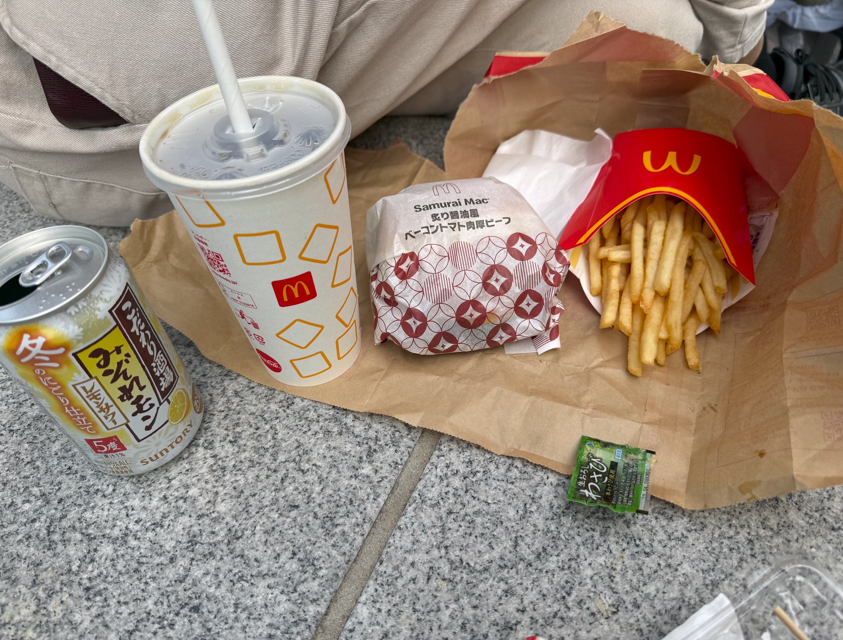 나와서는 또 난바 라이프 센트럴파크점에 가서 도시락과 주점부리를 사서 나와서 맥도날드에서 햄버거 세트를 사고 난바역 앞 광장에서 점심을 해결했습니다.
